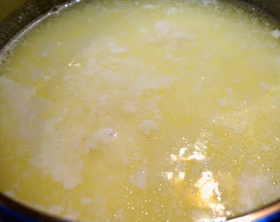 Na patelni rozpuścić 50 g masła. Przełożyć ser z sitka, dodać 2 łyżeczki soli i rozprowadzić po patelni ciągle mieszając.