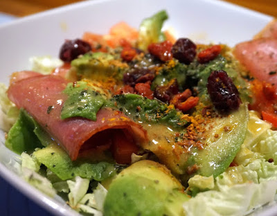 Kapustę pekińską oraz paprykę pokroić w drobne paski. Plasterki szynki parmeńskiej zrolować i pokroić w 1 cm rurki. Awokado przekroić na pół i usunąć pestkę. Za pomocą łyżeczki przełożyć miąższ do sałatki, zostawiając w dłoni wydrążoną skórę.