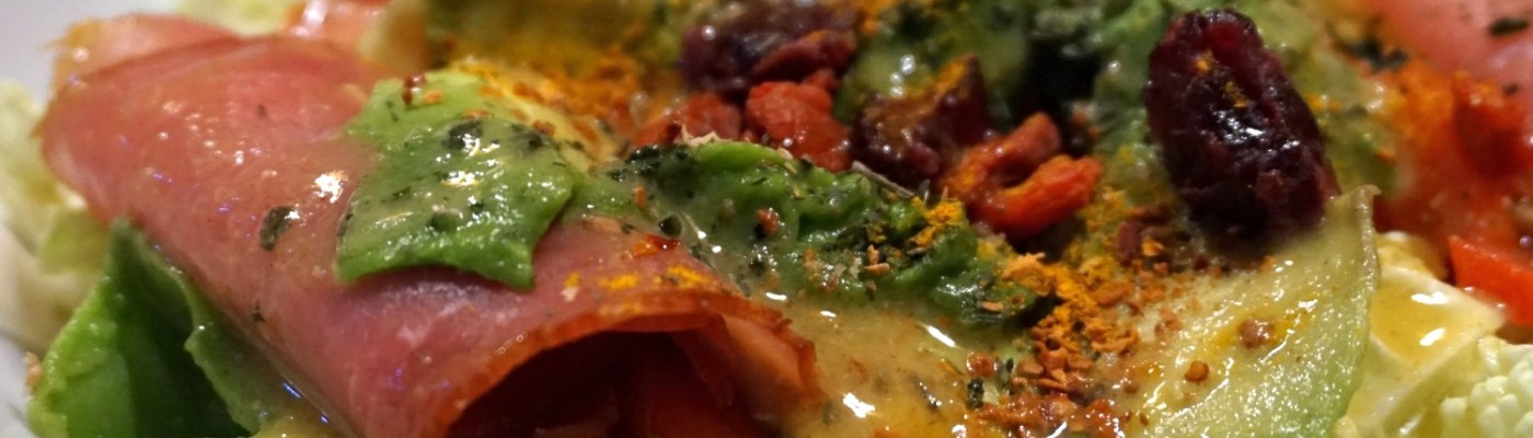 Sałatkę polać sosem oraz udekorować dodatkami: żurawina, kurkuma oraz suszona pokrzywa.