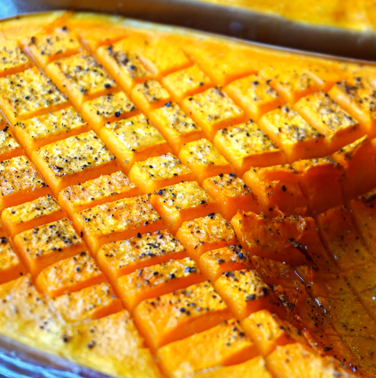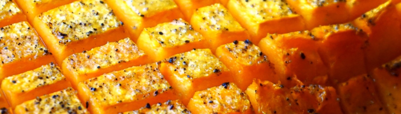 Dynię umyć, przekroić na pół i usunąć pestki. Naciąć za pomocą noża do pizzy, uważając, żeby nie przeciąć skóry. Polać z wierzchu olejem do smażenia oraz doprawić solą morską i pieprzem.