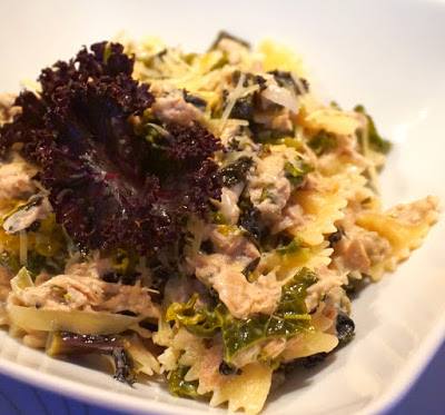 Na patelni z odrobiną oliwy zeszklić cebulę pokrojoną w kostkę. Następnie dodać przeciśnięte przez praskę 2 ząbki czosnku, krótko przesmażyć. Dodać zblanszowane liście jarmużu, a następnie tuńczyka wraz z olejem. Dusić pod przykryciem 10 minut. Doprawić do smaku solą morską i pieprzem.