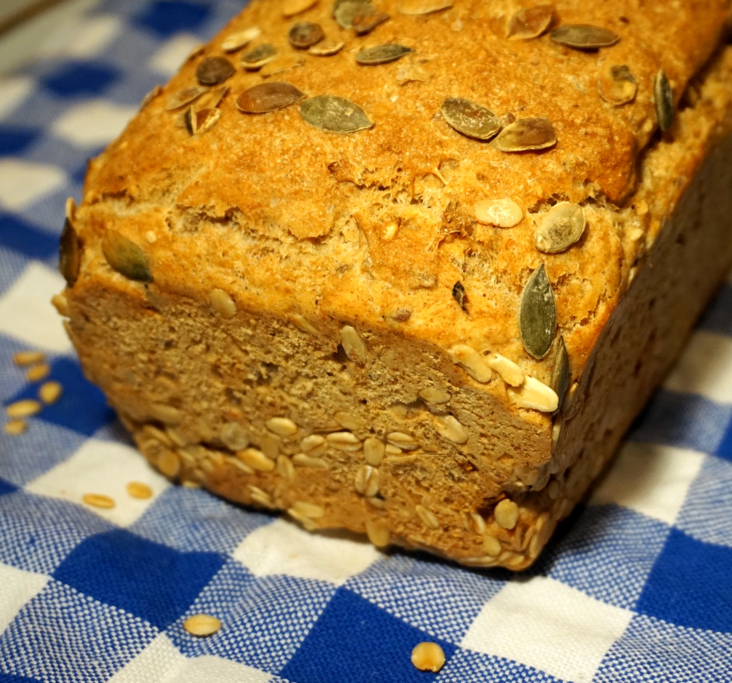 Foremkę 10×30 wysmarować olejem (3 ziarna) i obsypać płatkami górskimi. Przełożyć wyrośnięte ciasto z miski do foremki. Za pomocą mokrej łyżki wygładzić wierzch chleba. Udekorować pestkami dyni. Zostawić w foremce na 10 minut pod przykryciem w ciepłym miejscu do wyrośnięcia.
