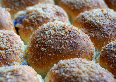 Z wyrośniętego ciasta formować bułeczki o średnicy ok. 3 cm. Kulkę rozpłaszczyć i włożyć do środka pół łyżeczki dżemu z czarnej porzeczki. Tak uformowane bułeczki układać obok siebie w tortownicy lub w prostokątnej formie na papierze do pieczenia. Papier uprzednio przesypać mąką, co ułatwia wyciąganie bułeczek z formy i przechowywanie (nie kleją się). Bułeczki posmarować z wierzchu zimną wodą za pomocą pędzelka kuchennego.