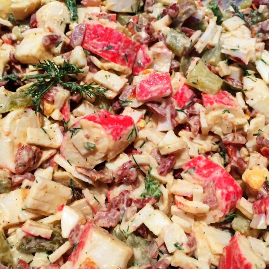 - Połączyć wszystkie składniki dodając sól morską, pieprz i majonez do smaku.