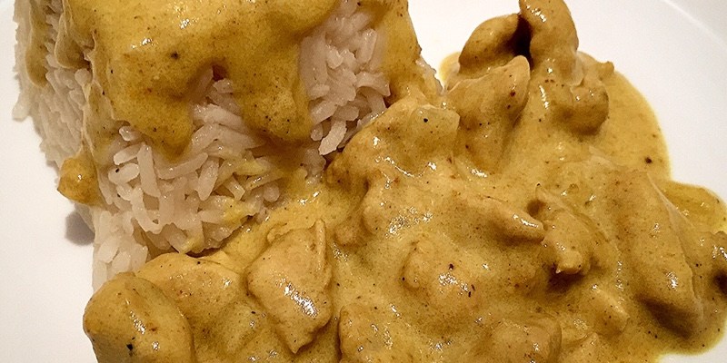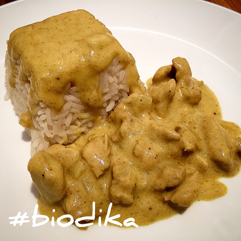 - Do odparowaniu wody z mięsa dodać mleko kokosowe oraz curry.
