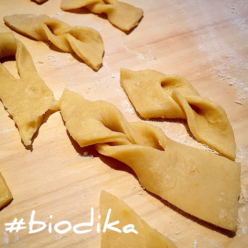 - Ciasto przewinąć przez środek, tworząc charakterystyczne kokardki.