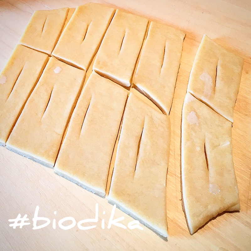 - Za pomocą noża (może być nóż do pizzy) uformować paski z nacięciem po środku.