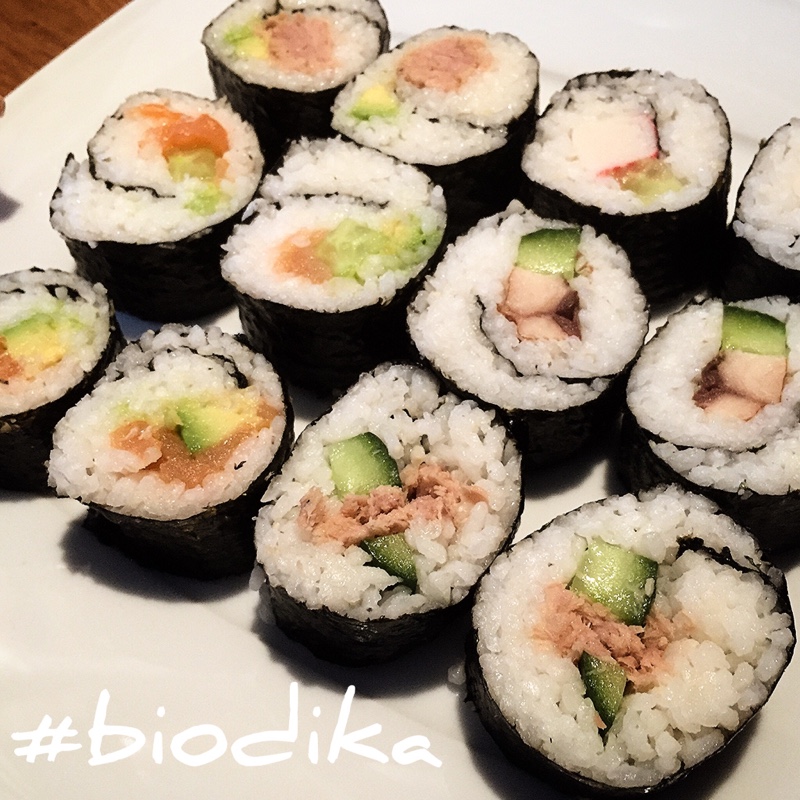 Do dekoracji wykorzystać biały sezam, a gotowe sushi podawać z marynowanym imbirem, ciemnym sosem sojowym i pastą wasabi.