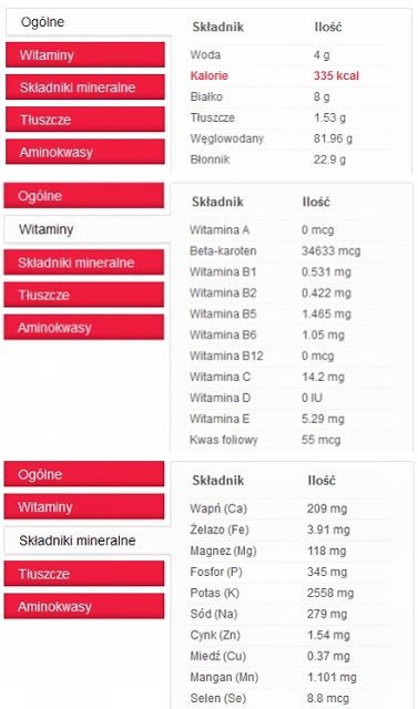 Dla zainteresowanych podaję źródło z iWoman.pl gdzie można sprawdzić zawartości witamin i składników mineralnych w 100 g suszonej marchewki.