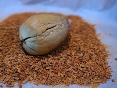 Tak rozdrobnioną pestkę przełożyć na blachę wyłożoną pergaminem i suszyć w temp. 60 st. C przez ok. 2-3h. Ja wykorzystuje do tego celu półkę nad kominkiem, ale równie dobrze może to być kaloryfer lub piekarnik (to najdroższa opcja). Rozdrobnioną pestkę można uznać za wysuszoną w momencie, kiedy kruszy się podczas rozgniatania między palcami.