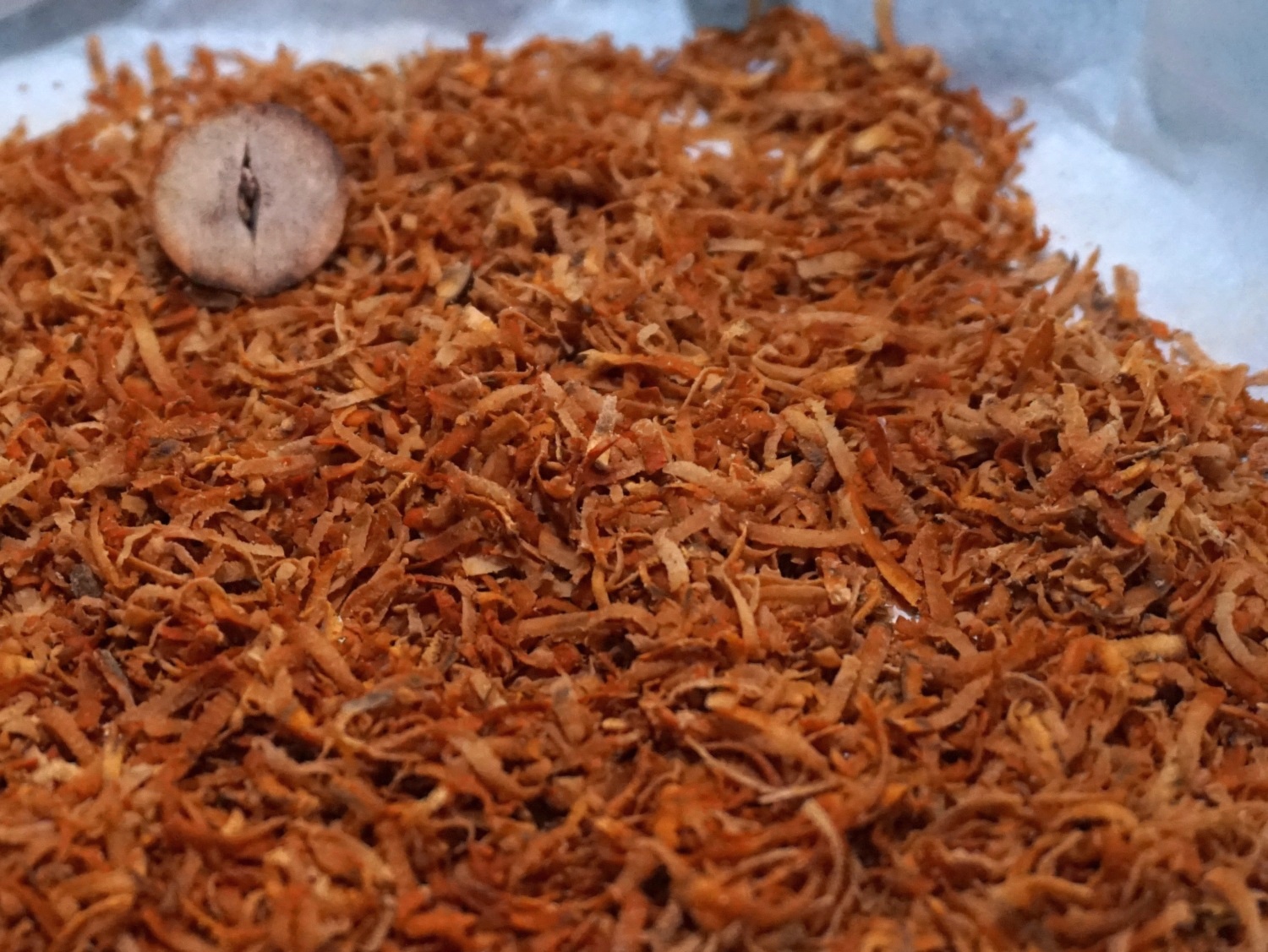 Tak rozdrobnioną pestkę przełożyć na blachę wyłożoną pergaminem i suszyć w temp. 60 st. C przez ok. 2-3h. Ja wykorzystuje do tego celu półkę nad kominkiem, ale równie dobrze może to być kaloryfer lub piekarnik (to najdroższa opcja). Rozdrobnioną pestkę można uznać za wysuszoną w momencie, kiedy kruszy się podczas rozgniatania między palcami.