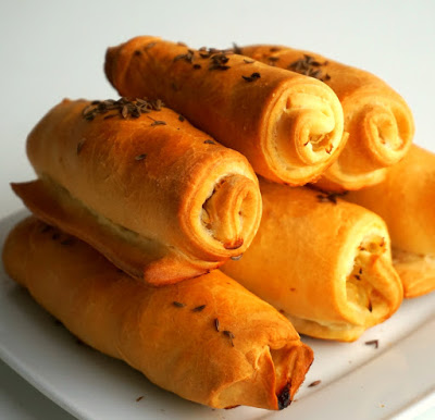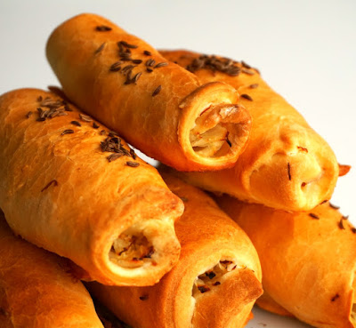 Ciasto rozwałkować podsypując mąką. Z ciasta o grubości 4-5 mm, wyciąć za pomocą noża, prostokątne kawałki 10×15 cm lub krążki o średnicy 15 cm. Osobiście polecam krążki, ponieważ wychodzą z nich bardzo apetyczne, pękate paluchy. Nadziewać przygotowaną wcześniej kapustą i zwijać pozostawiając na końcu miejsce na sklejenie.